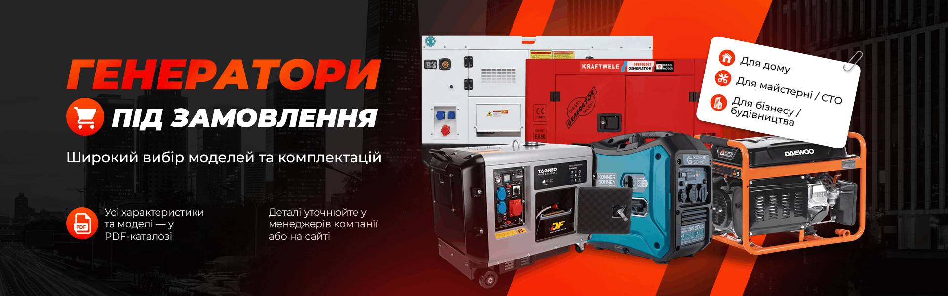 Світло має бути завжди — вдома, в майстерні чи на будівництві.У нас ви можете замовити генератор під свої потреби:Для домуДля майстерні / СТОДля бізнесу та будівництваШирокий вибір моделей та комплектацій.Усі характеристики — у PDF-каталозі.